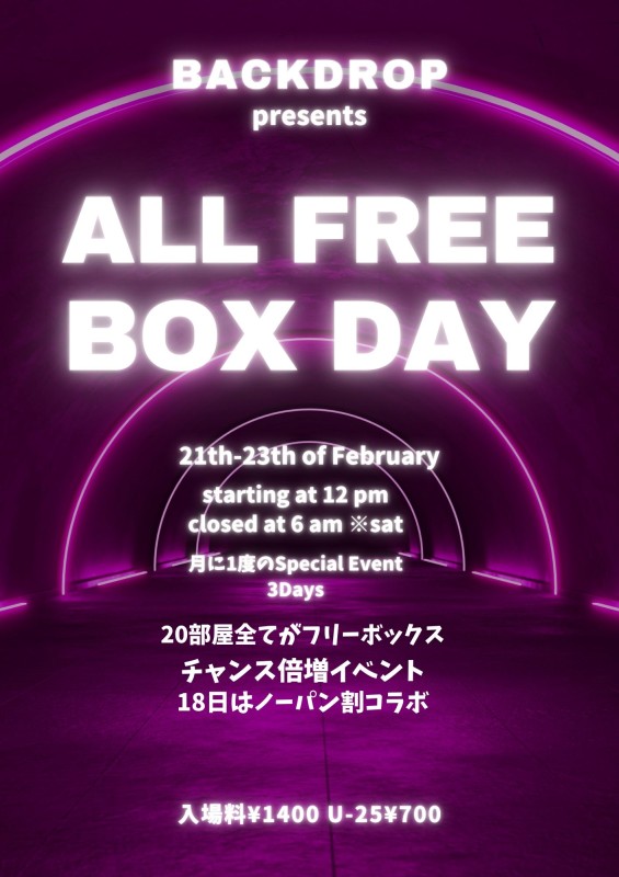 ★オールフリーボックス3DAYS★ 2月21日~23日 大好評マンスリーイベント! 更に店内(受付・待合室を除く)すべてのライトがブラックライトに エロ度アップな激熱な3日間 この日限定で店内の20部屋全ての個室がフリボに変身! 出会い率Max!!! *イベントの性質上この日はDVDの貸し出しはありません